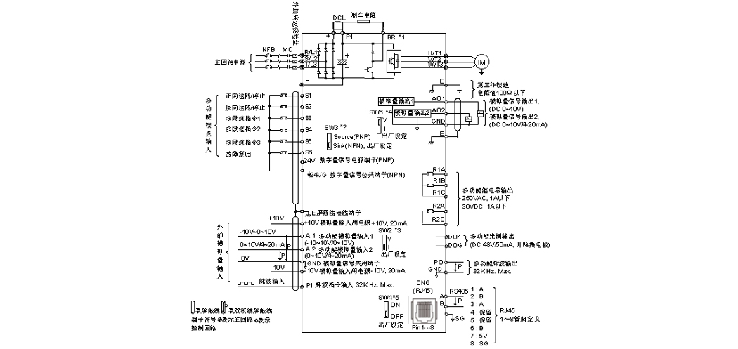 以下為T310變頻器標準配線圖(◎表示主回路端子,○表示控制回路端子)。T310依型號不同,配線端子臺的位置及符號會稍有差異,主回路端子及控制回路端子說明請參考說明書。